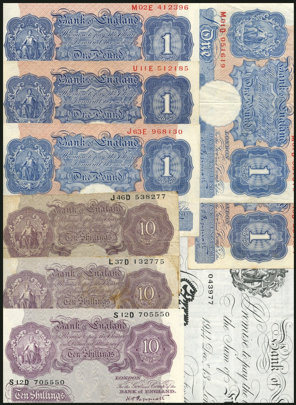 Bank of England, K.O.Peppiatt, a group of notes including £5, 13 December 1944, prefix E88, black and white, 10/- (3), 1940, mauve, £1 (5), 1940, blue and tan, and £1, 1948, green