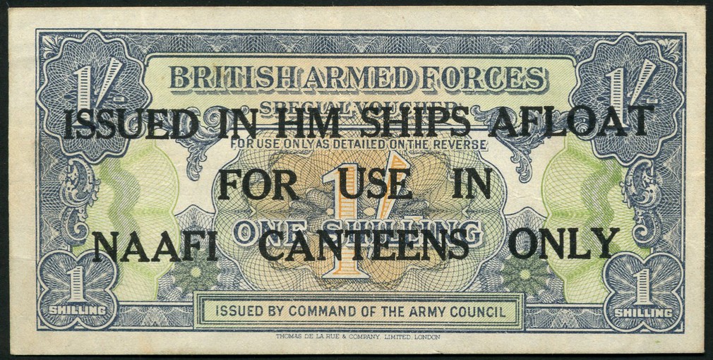 British Armed Forces, 1 shilling special voucher, ND (1946), blue-grey on multicolour underprint, value in each corner and at centre, reverse, blue-grey, overprinted "ISSUED IN HM SHIPS AFLOAT FOR USE IN NAAFI CANTEENS ONLY", also 2 round discs and 2 octagonal discs, black on dark brown