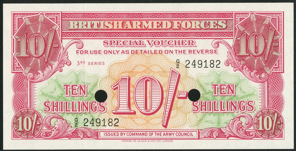British Armed Forces, a group of third series special vouchers comprising 3 pence, 1 shilling (2) (one of which is hole punch cancelled), 10 shillings (2) (one of which is hole punch cancelled) and £1, ND (1956), green and orange, blue on multicolour, red on multicolour and brown on multicolour respectively