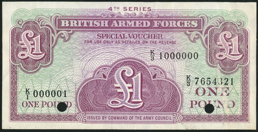 British Armed Forces, specimen 4th series special vouchers comprising 3 pence, green and lilac, 6 pence, blue, light green and pink, 1 shilling, brown, olive green and orange, 10 shillings, mauve, light blue and green and £1, mauve and green, all ND (1962), the 10 shilling and £1 hold punched