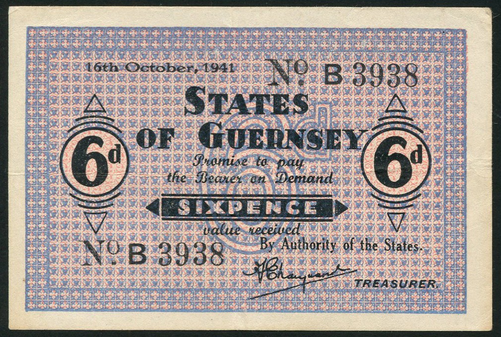 States of Guernsey, 6D, 16 October 1941, serial number B 3938, mauve and pink with text in black, value at centre and at left and right, reverse mauve, arms at centre