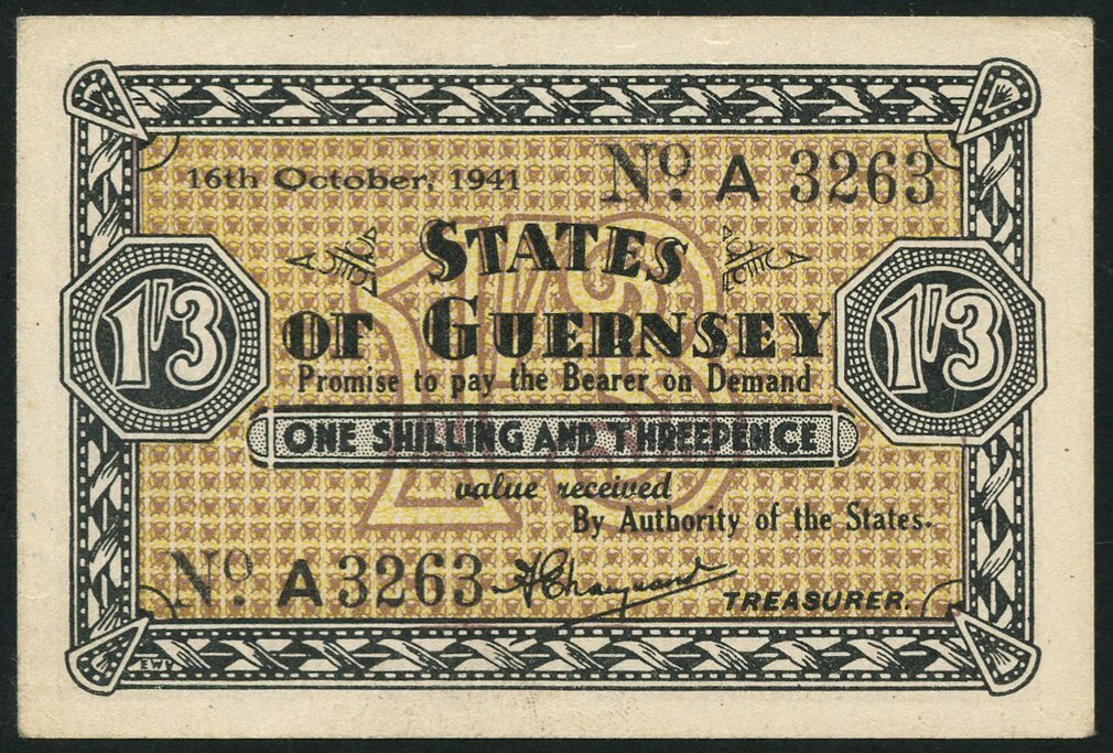 States of Guernsey, 1/3D, 16 October 1941, serial number A 3263, black and pale brown, value in underprint at centre, value at left and right, reverse brown, arms at centre
