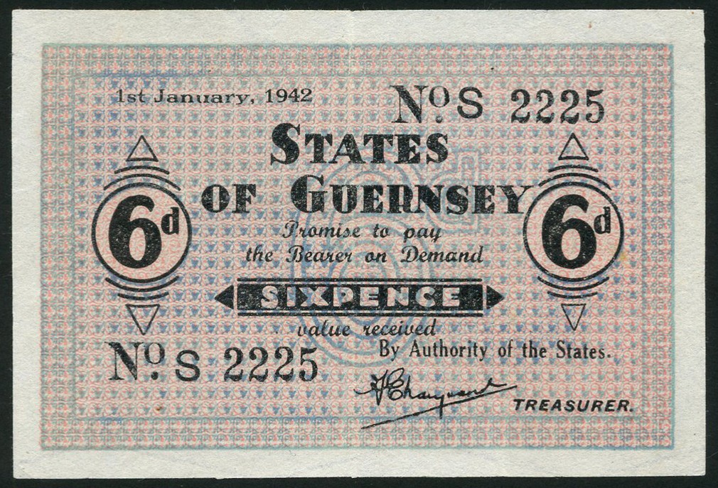 States of Guernsey, 6D, 1 January 1942, serial number S 2225, mauve and pink with text in black, value at centre and at left and right, reverse mauve, arms at centre