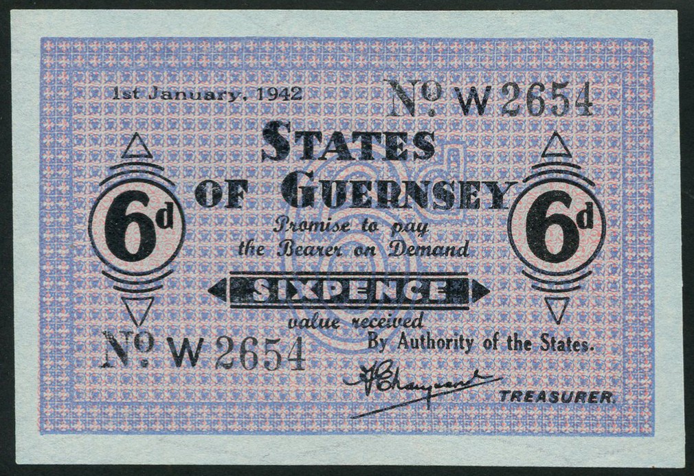 States of Guernsey, 6D, 1 January 1942, serial number W 2654, black text on mauve, Marquand signature, reverse mauve, arms at centre