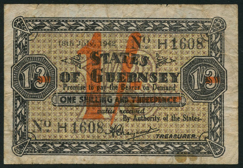 States of Guernsey, 1/- overprint on 1/3D, 18 July 1942, serial number H 1608, black and pale brown, value of 1/- in orange overprint at centre, value at left and right, reverse grey, arms at centre