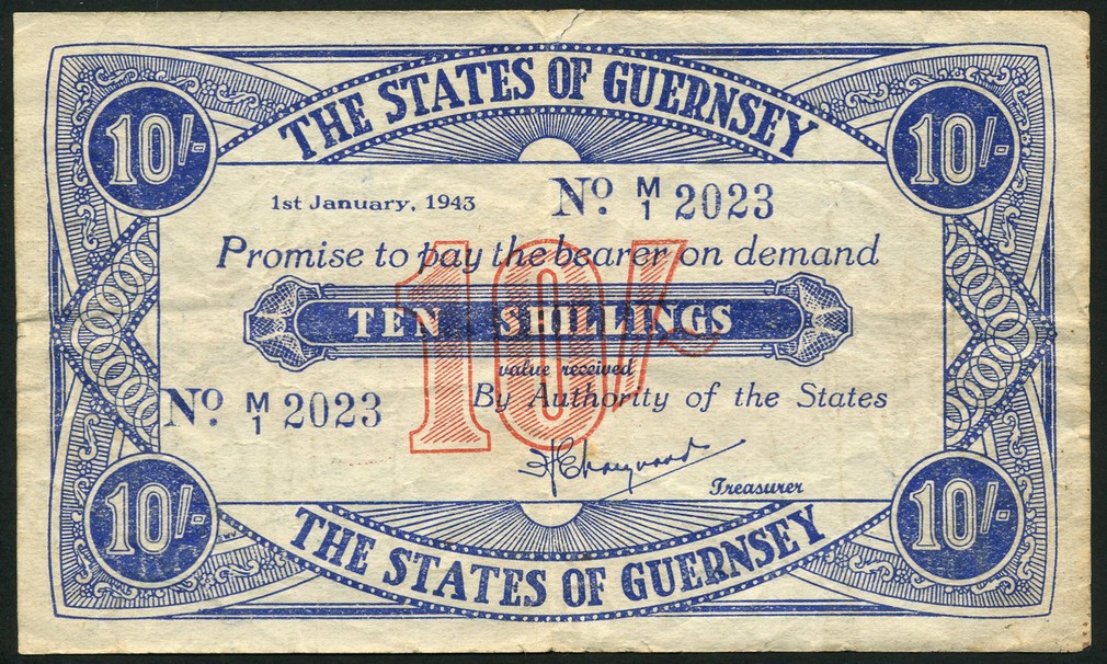 States of Guernsey, 10 shillings, 1 January 1943, serial number M1 2023, blue and red, value in each corner and at centre, reverse, red, also one shilling on threepence, orange overprint denoting new denomination of 1 shilling, 1 January 1943, serial number T 1628, black on yellow underprint