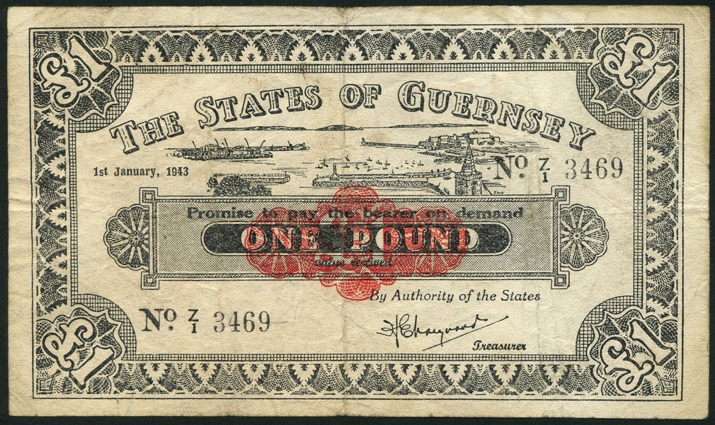 States of Guernsey, £1, 1 January 1943, serial number Z/1 3469, black and white, value in red guilloche at centre, value at each corner, view of Saint Peter Port top centre, Marquand signature, reverse blue and white, arms at centre