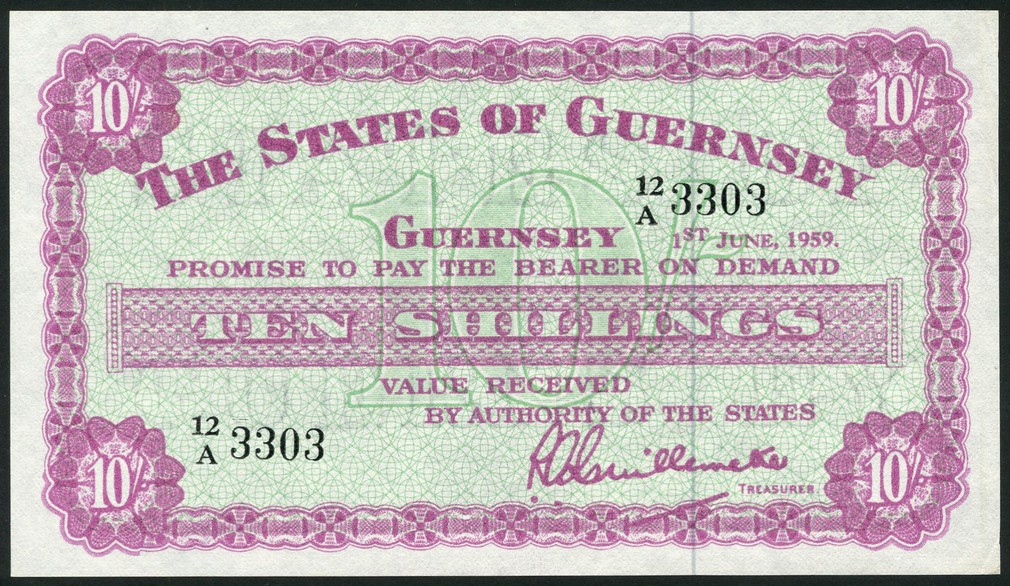 States of Guernsey, 10 shillings, 1 June 1959, serial number 12/A 3303, lilac and green, value at centre and at each corner, Guillemette signature, reverse violet, arms at centre