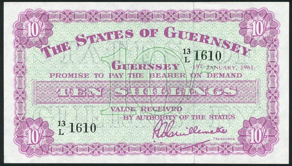 States of Guernsey, 10 shillings (2), 1 January 1961 and 1 March 1962, prefixes 13/L and 15/M, lilac and green, value at centre and at each corner, Guillemette signature, reverse violet, arms at centre