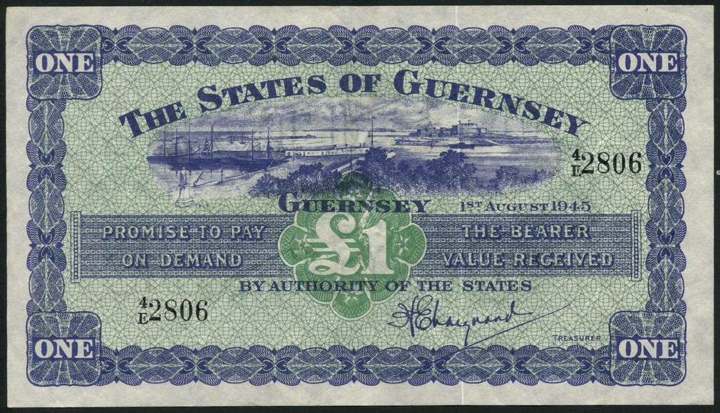States of Guernsey, £1, 1 August 1945, serial number 4/L 2806, violet and green, view of Saint Peter Port top centre, value at centre and at each corner, Marquand signature, reverse green, arms at centre