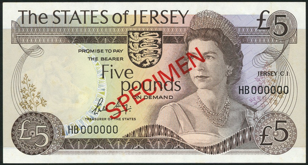 States of Jersey, specimen £1, ND (1985), serial number TB000000, dark blue, and specimen £5, NS (1983), serial number HB000000, brown, both with Elizabeth II at centre right, arms at top centre, both with red SPECIMEN overprint