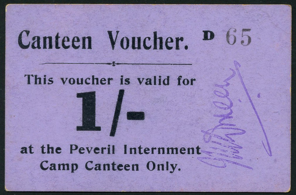 Peveril Internment Camp. 1 Shilling canteen voucher on card, ND (1940-45), serial number D 65, mauve, black text, handstamped signature at right