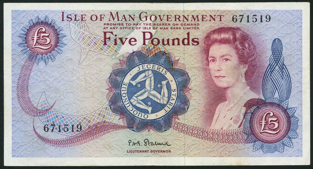 Isle of Man Government, £5, ND (1961), serial number 671519, green and blue on multicolour underprint, Queen Elizabeth II at right, arms at centre, Stallard signature, reverse Castle Rushen, 1775 at centre