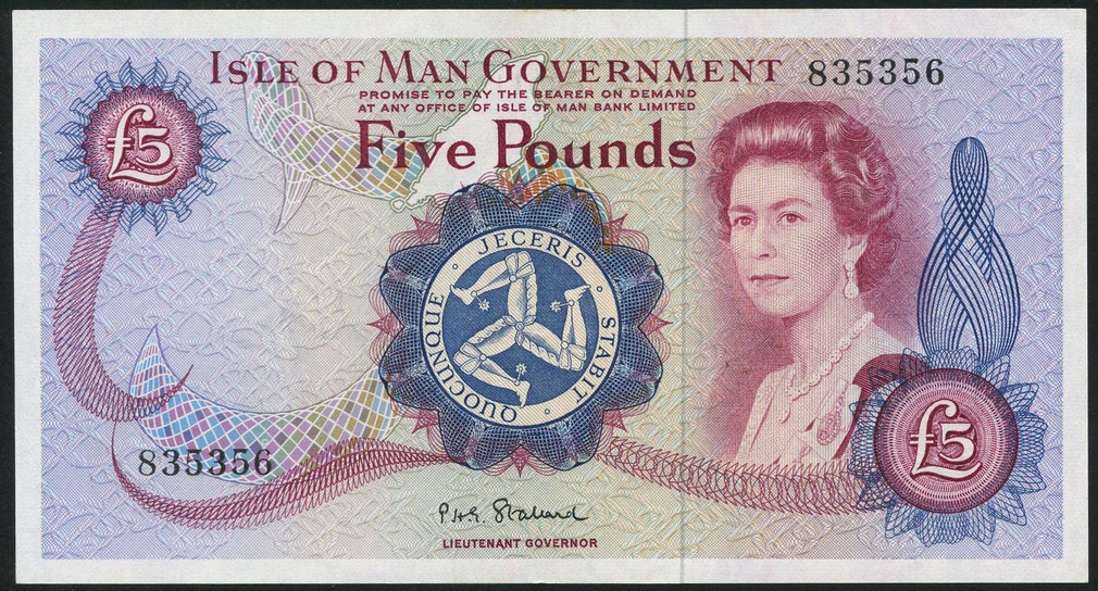 Isle of Man Government, £5, ND (1961), serial number 835356, green and blue on multicolour underprint, Queen Elizabeth II at right, arms at centre, Stallard signature, reverse Castle Rushen, 1775 at centre