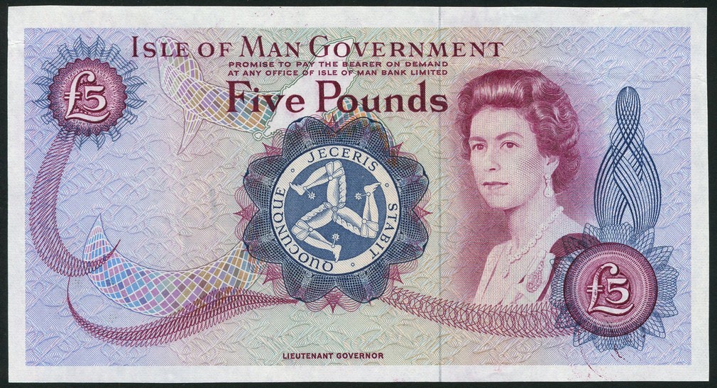 Isle of Man Government, unissued £5, ND (1972-79), no serial numbers, signature title Lieutenant Governor, no signature, purple and blue on multicoloured underprint, portrait of Queen Elizabeth II by Anthony Buckley at right, triskeles at centre, reverse grey-green, Castle Rushen,