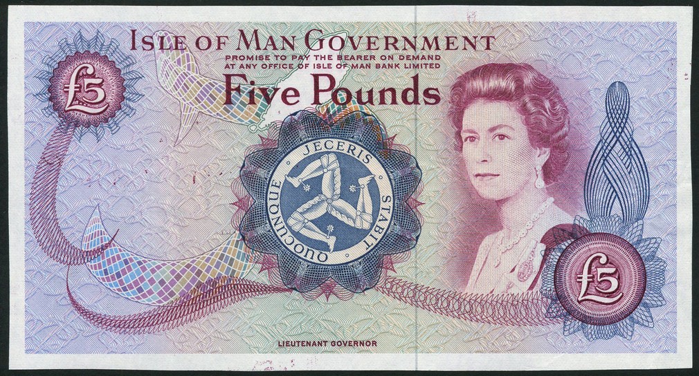 Isle of Man Government, unissued £5, ND (1972-79), no serial numbers, signature title Lieutenant Governor, no signature, purple and blue on multicoloured underprint, portrait of Queen Elizabeth II by Anthony Buckley at right, triskeles at centre, reverse grey-green, Castle Rushen,