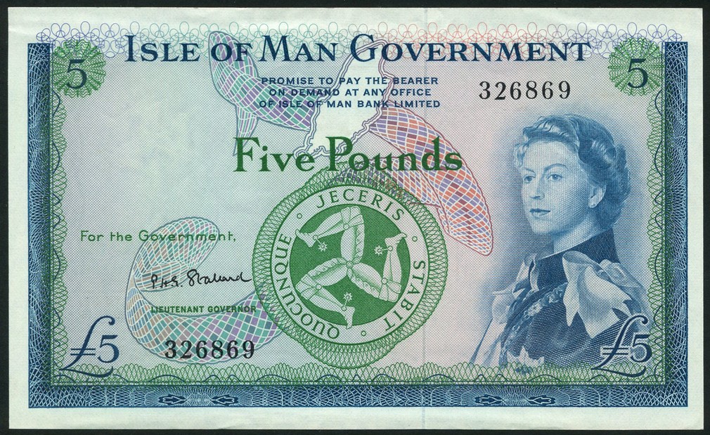 Isle of Man Government, £5, ND (1967), serial number 326869 blue and green on multicolour underprint, Elizabeth II at right, arms at low centre, value at each corner, Stallard signature, reverse dark grey, Castle Rushen