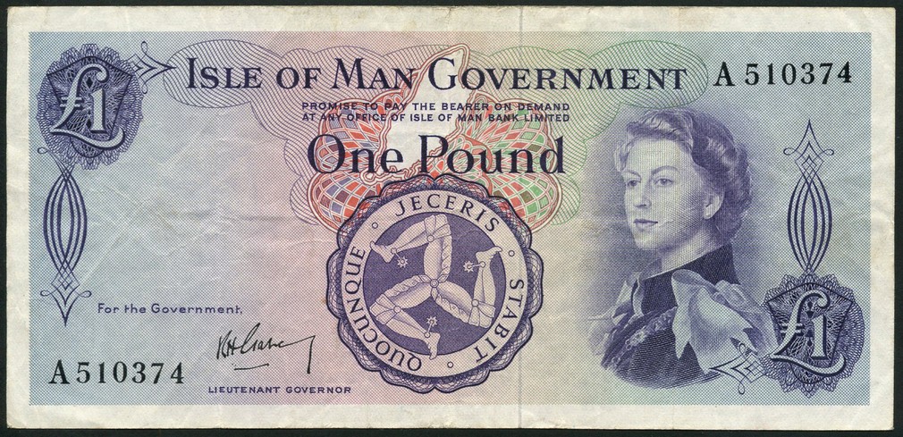 Isle of Man Government, 50 pence, ND (1979), £1 (3), ND (1983), ND (1961), ND (1961), blue on multicolour underprint, Queen Elizabeth II at right, arms at centre, reverse viking ship in full sail, and purple on multicolour underprint, Queen Elizabeth II at right, arms at centre, reverse Tynwald Hill respectively