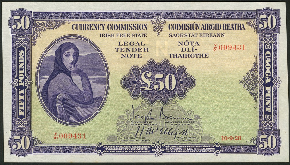 Currency Commission, Irish Free State, £50, 10 September 1928, red serial number Y/01 009431, violet, pale green and pale yellow-orange, Hazel Lady Lavery at left in oval frame, value in ornate guilloche at centre, value at each corner, Brennan and McElligott signatures low centre, reverse violet and pale green, river God (Shannon) at centre with trident, value below