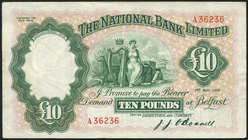 National Bank of Ireland Limited, £10 (2), 2 May 1949, red prefix A, pink and green, Hibernia at centre, O'Donnell signature