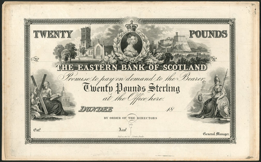 The Eastern Bank of Scotland, obverse die proof for a twenty pounds sterling, ND (c.1938), black, Queen Victoria at top centre, Dundee Church at top left, Edinburgh Castle at top right, Saint Andrew at low left, Britannia at low right