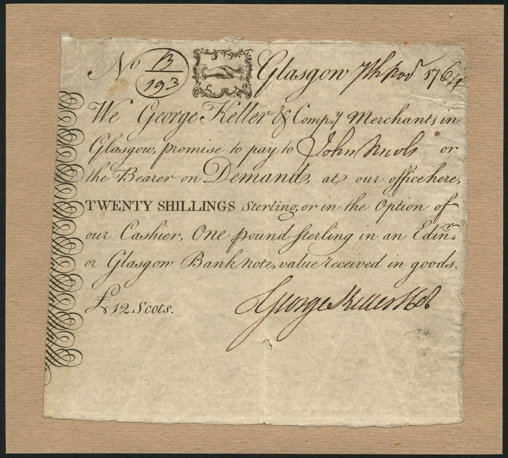 George Keller & Company, Glasgow, 20 shillings, 7 November 1764, serial number 13/193, black text on white paper, clasped hands top centre, manuscript signature of George Keller low right