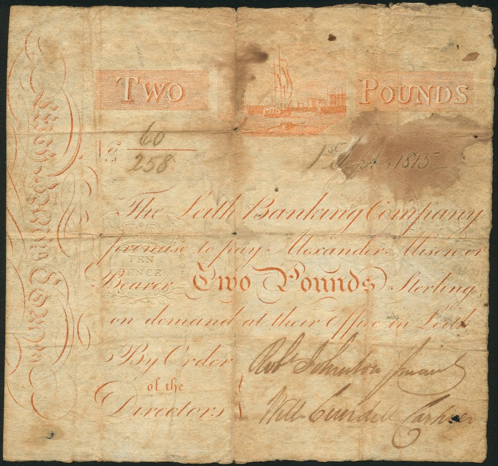 Leith Banking Company, £2, 1 September 1815, serial number 60/258, red text on cream paper, ship in Leith harbour top centre, value in red tablet top left and right, two manuscript signatures low right, pay to Alexander Alison in text at centre,