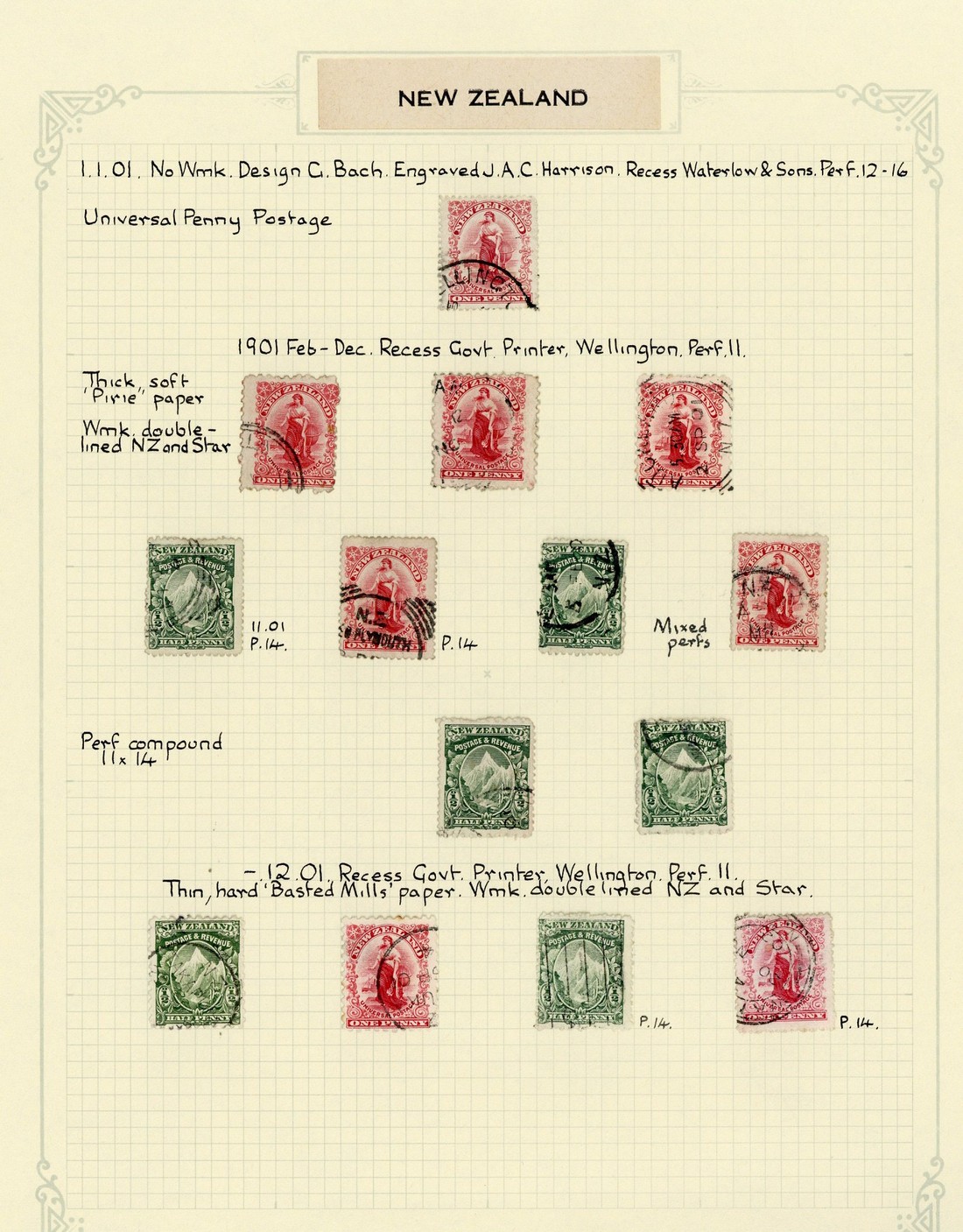 1901-06 ½d. Mount Cook and 1d. Universal mint collection (54), including 1901 Pirie paper mixed perf. ½d. and 1d.; 1901 Basted Mills paper perf. 11 ½d. and 1d., perf. 14 ½d., perf. 14x11 or 11x14 ½d. (3) and mixed perfs. 1d.; 1902 Cowan paper perf. 11 ½d., perf. 14x11 ½d. and 11x14 ½d. (3), and mixed perfs. ½d. and 1d. (2); 1904 "dot" plates, perf. 11x14 and mixed perfs.; 1906 new Royle plates perf. 11, mixed perfs. and perf. 14x14½ (2); generally good to fine