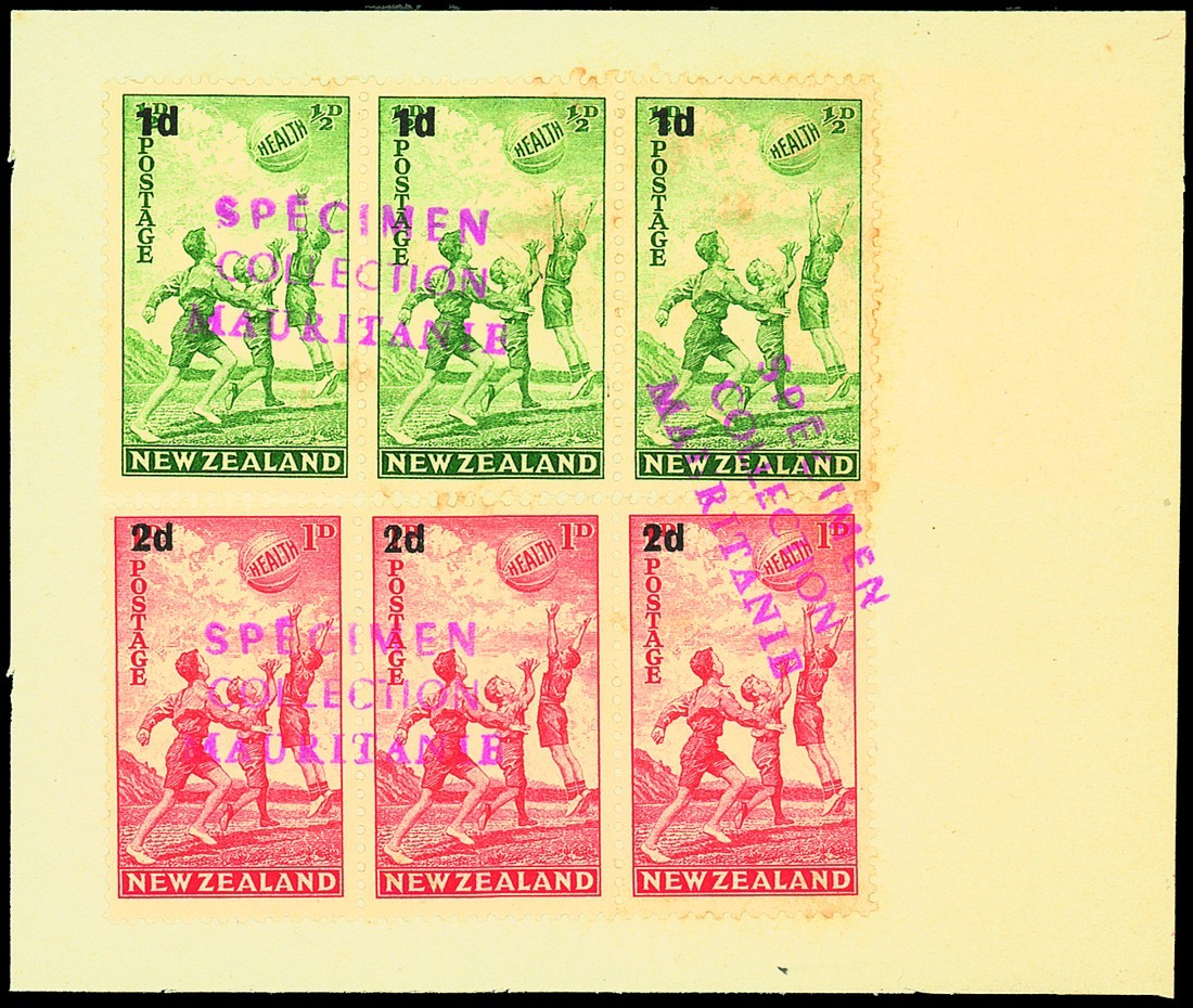 1939, 1940 and 1941 Health sets, three examples of each, mostly in strips, cancelled with several "spécimen/collection/mauritanie" handstamps with each set on an archival piece; some light staining though a unique group. Photo