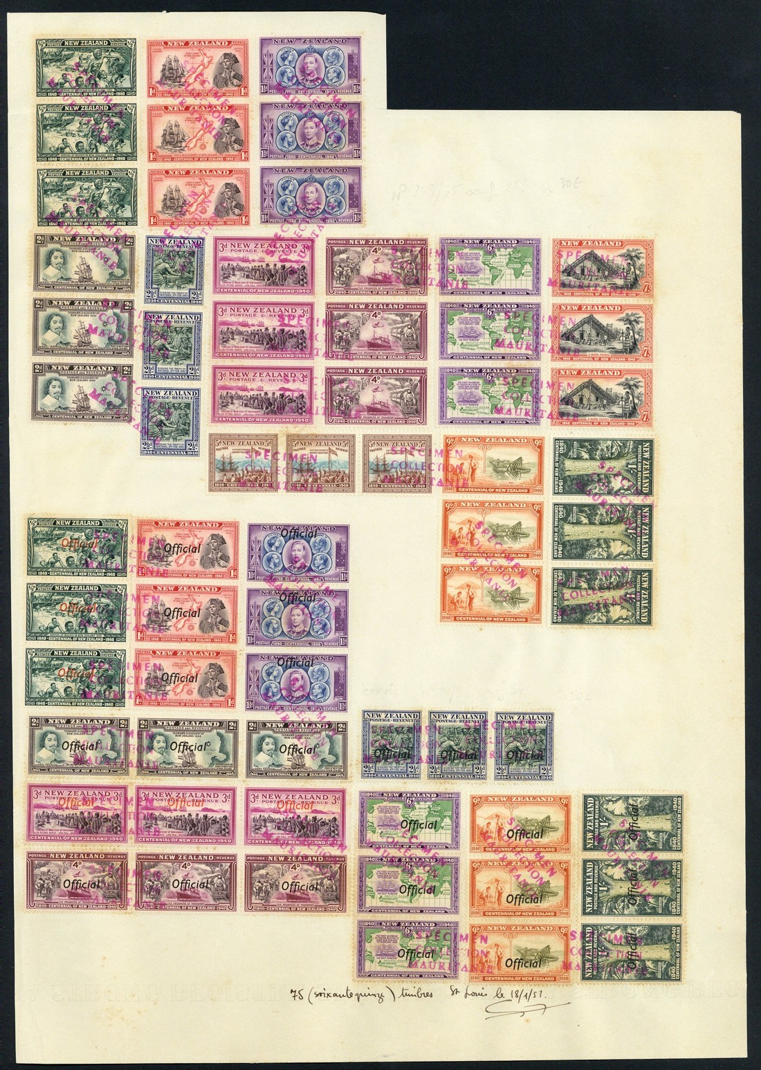 1940 Centenary ½d. to 1/- set of twelve and companion Official ½d. to 1/- set of ten, all in horizontal or vertical strips of three cancelled with several "spécimen/collection/mauritanie" handstamps on large archival piece with the two 8d. values on separate small pieces; some light staining though a unique record