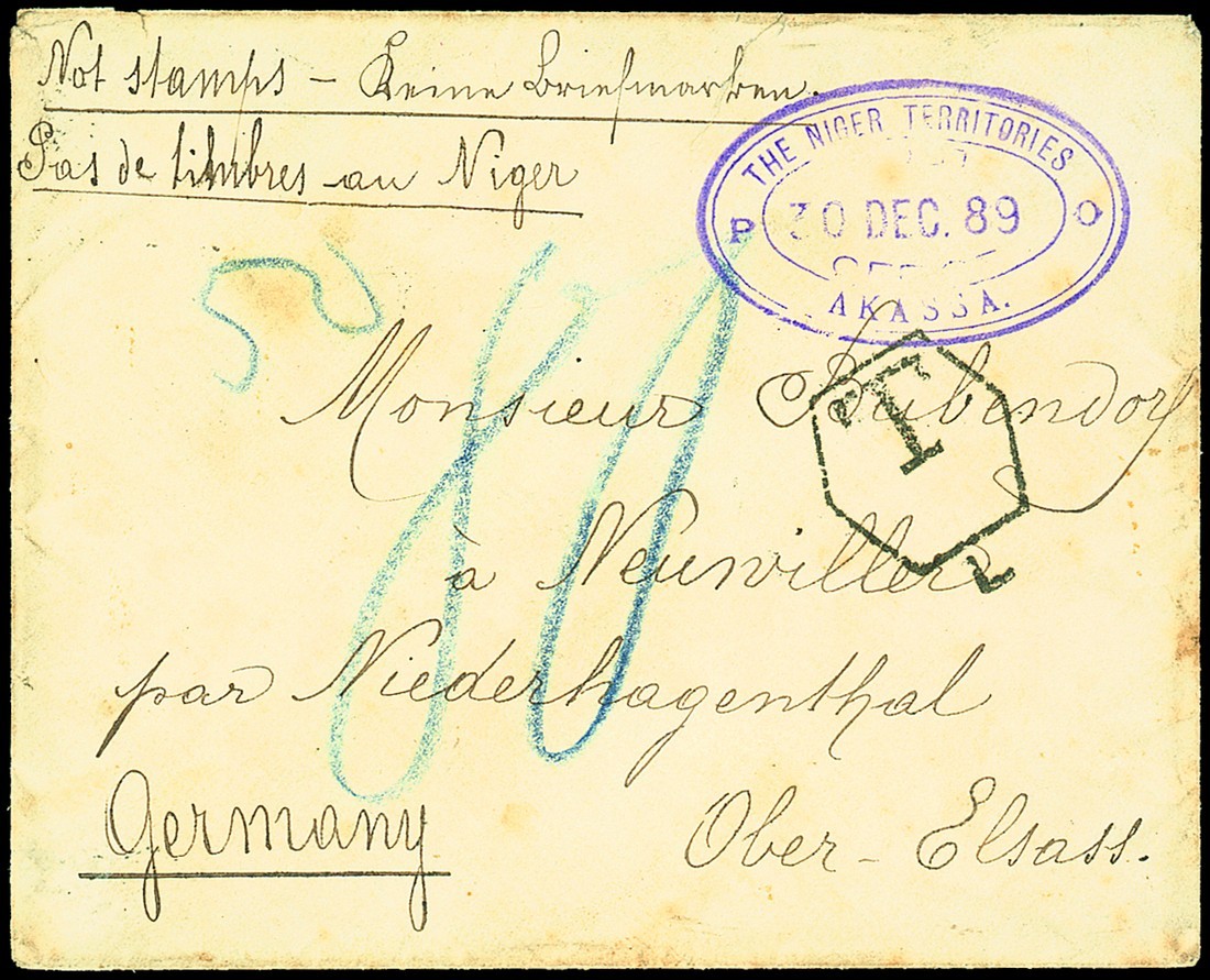 Akassa "the niger territories/post/office/p o/akassa." triple-oval d.s. Sacher Type 2, S.G. Type 1
