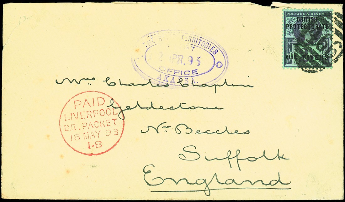 1893 (2 Apr.) envelope to Beccles, showing a generally fine strike of the datestamp and bearing Oil Rivers 1892-94 2½d. purple on blue cancelled "466" in transit at Liverpool, Paid Liverpool Br. Packet c.d.s. (18.5) at left, arrival c.d.s. (19.5) on reverse; attractive. S.G. 4. Photo