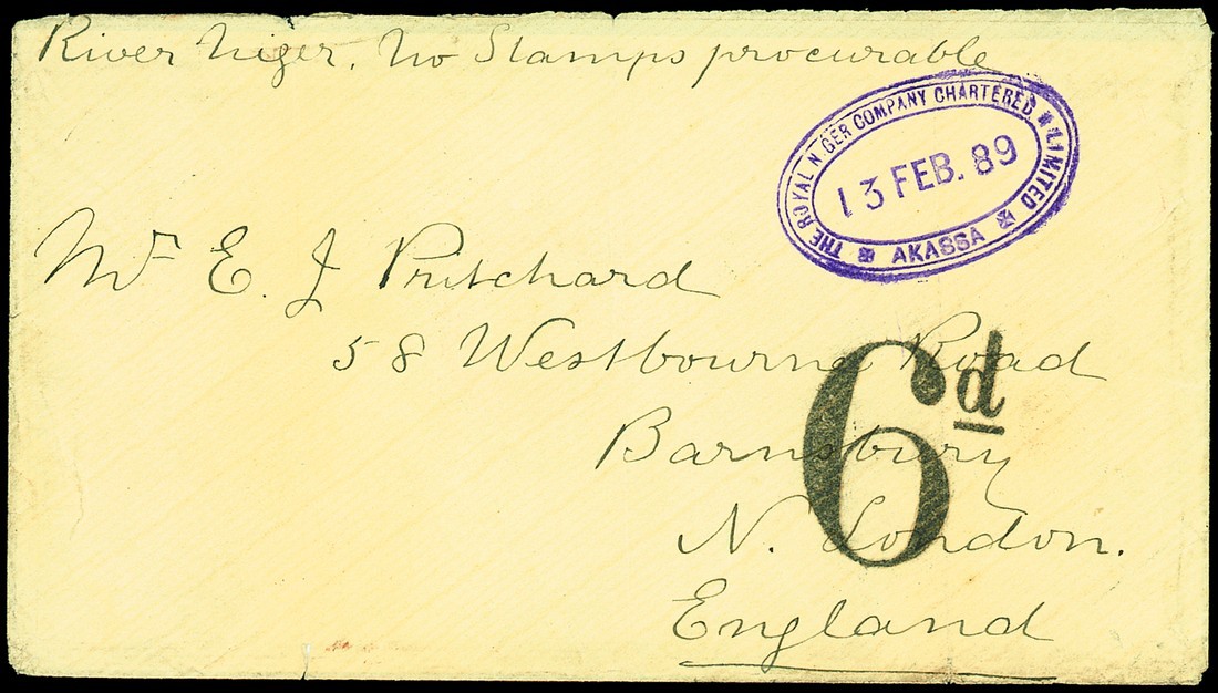 1889 (13 Feb.) unstamped envelope from Akassa to England, marked "River Niger. No Stamps procurable" and showing a superb strike of "the royal company chartered & limited/akassa" triple-oval d.s. (sachet Type 1, S.G. Type 3) alongside "6d" tax h.s., the reverse with Liverpool Br. Packet (20.3) and London (20.3) c.d.s.; three vertical creases, one of which crosses the handstamp, barely affecting the fine appearance of this outstanding handstamp. Photo