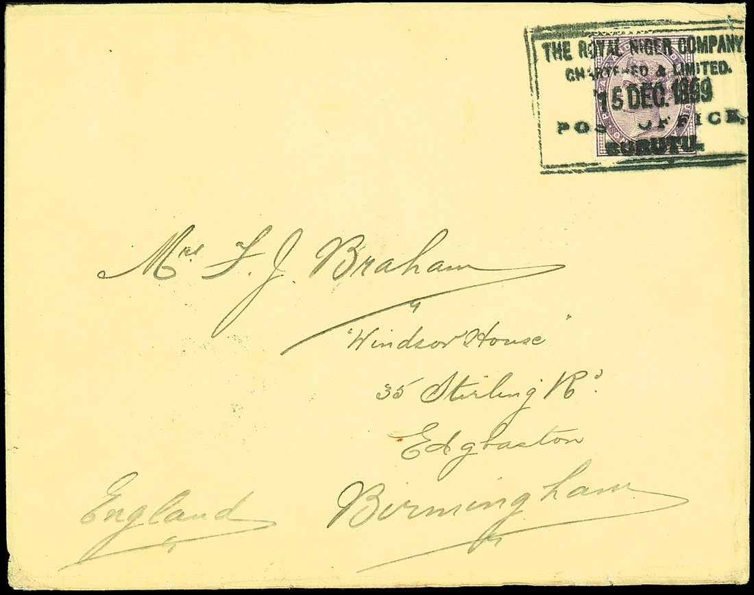 Burutu "the royal niger company/chartered & limited./post office./burutu." double-framed d.s. in seriffed letters. Sacher Type 10, S.G. Type 4