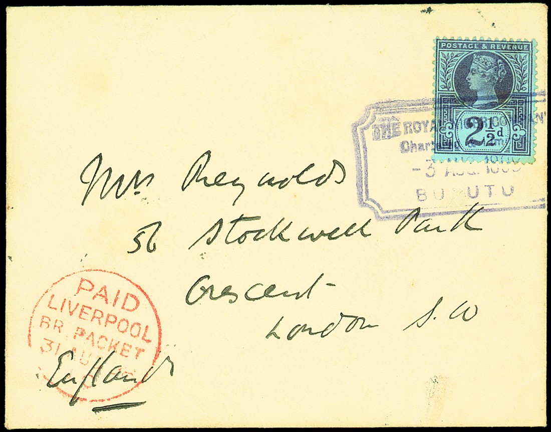 1898 (3 Aug.) envelope to London, bearing 1887-92 2½d. purple on blue cancelled with a generally fine large part strike of the datestamp and with Paid Liverpool Br. Packet c.d.s. (31.8) at left, London c.d.s. (31.8) on reverse; a clean and attractive cover with this rare datestamp. S.G. Z69. Photo