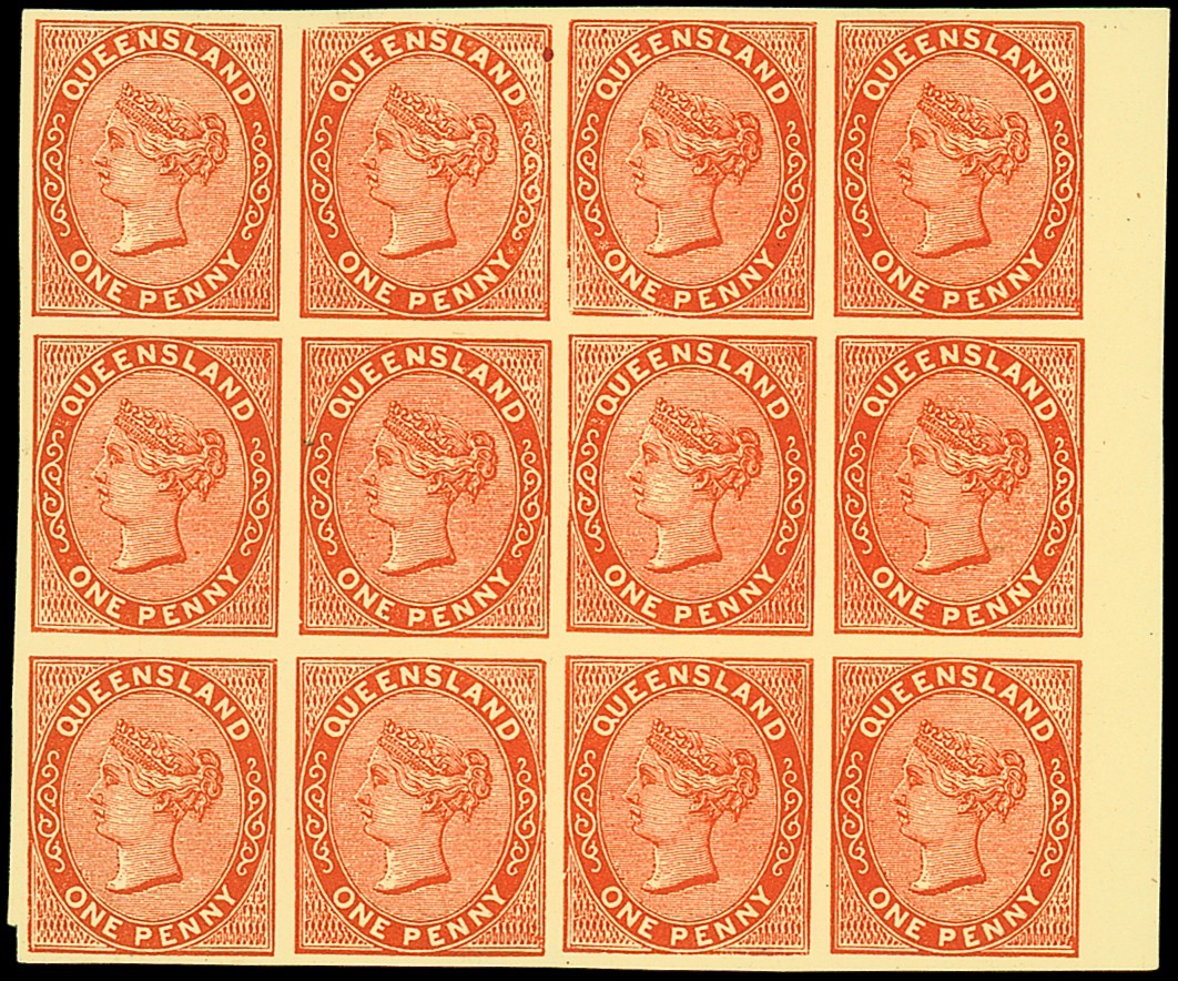 1d. reddish brown Die I marginal block of twelve, [67-70/77-80/87-90]; the left vertical row creased though of fine appearance. Photo