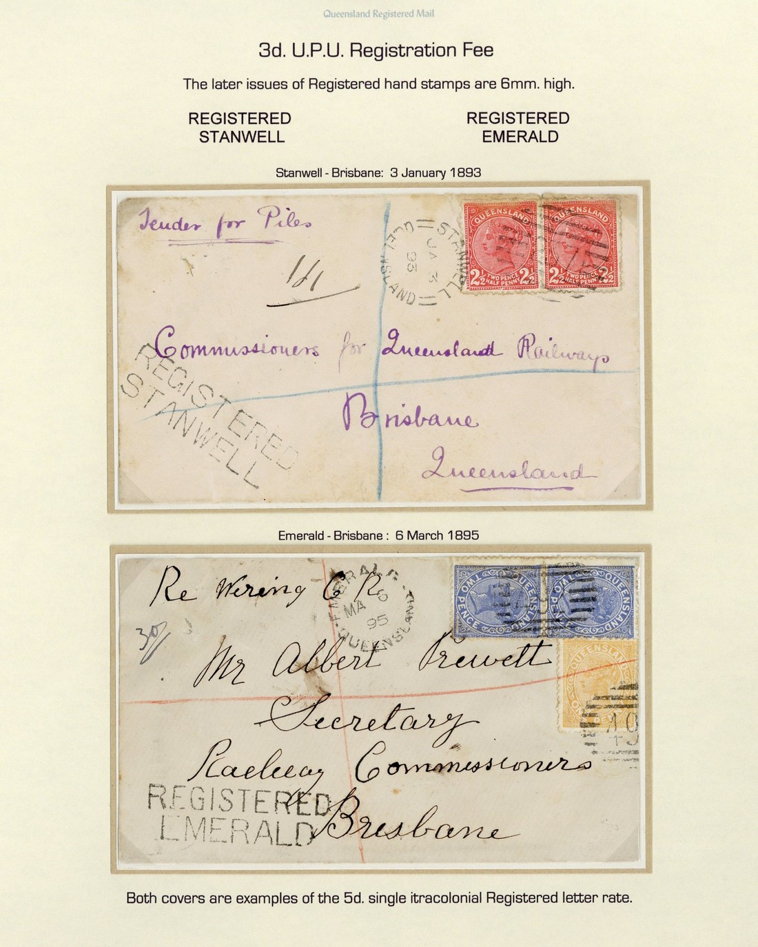 1893-94 envelopes (5) all to Brisbane and franked at 5d. (2d. postage, 3d. registration), comprising items from Emerald, Landsborough, Springsure, Stanwell and Yandina, all with appropriate registration handstamps, that for Landsborough cancelling the stamps (3d. in postage on reverse with sunburst "141"), the cover from Springsure with sunburst and registration handstamp in deep red; a couple with stains though an attractive group