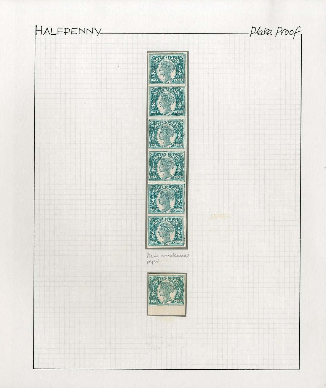 ½d. plate proof in green on highly surfaced unwatermarked wove paper, a vertical strip of six; horizontal crease towards foot, otherwise fine, and a marginal single, vertical crease