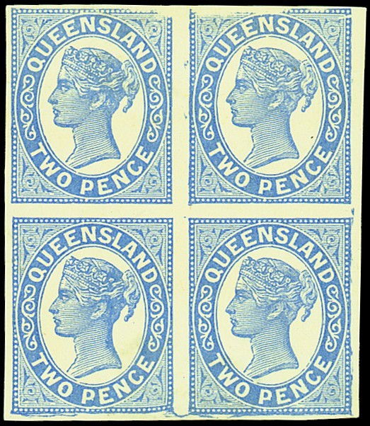 2d. blue plate proof block of four on unwatermarked wove paper; trace of thinning, otherwise fine. Photo