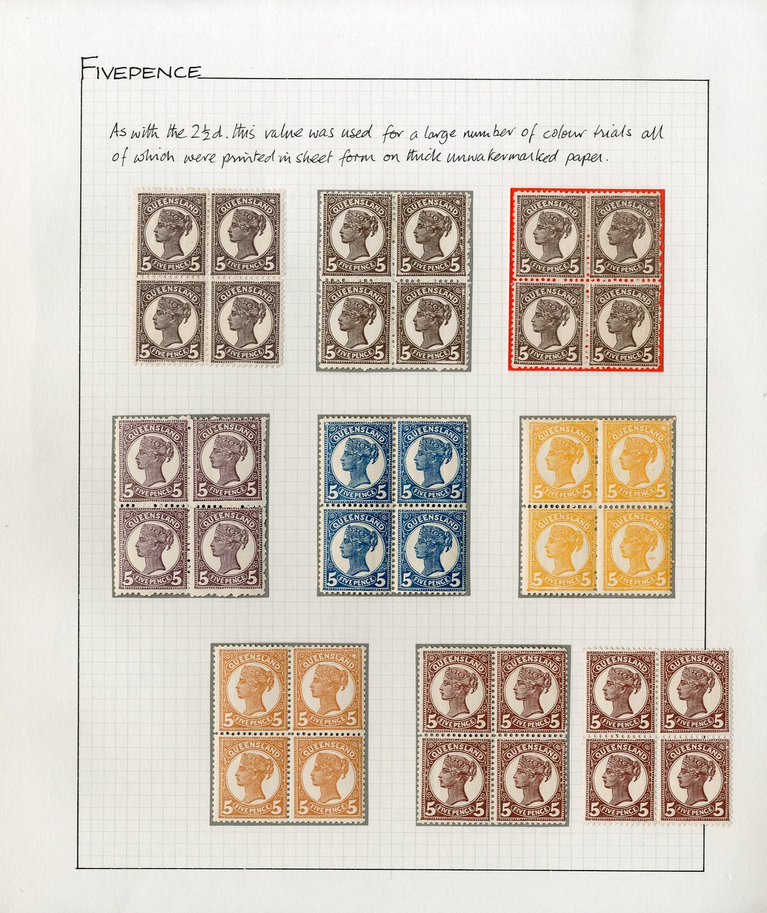 5d. on thick unwatermarked paper, blocks of four in grey-brown (3), slate-violet, deep blue, yellow, bistre and brown-purple (2); fine