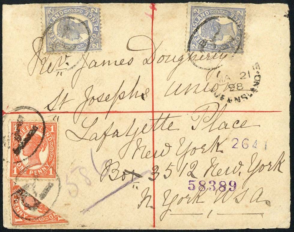 1898 (Mar.) envelope from an unknown office to New York, bearing 1d. (2, one bisected diagonally) and 2d. (2) all cancelled "R" in oval, showing U.S. registration number handstamps and, on reverse, Brisbane, San Francisco and New York registered datestamps. A rare and most unusual unauthorised use of a bisect which has been accepted without surcharge. Photo