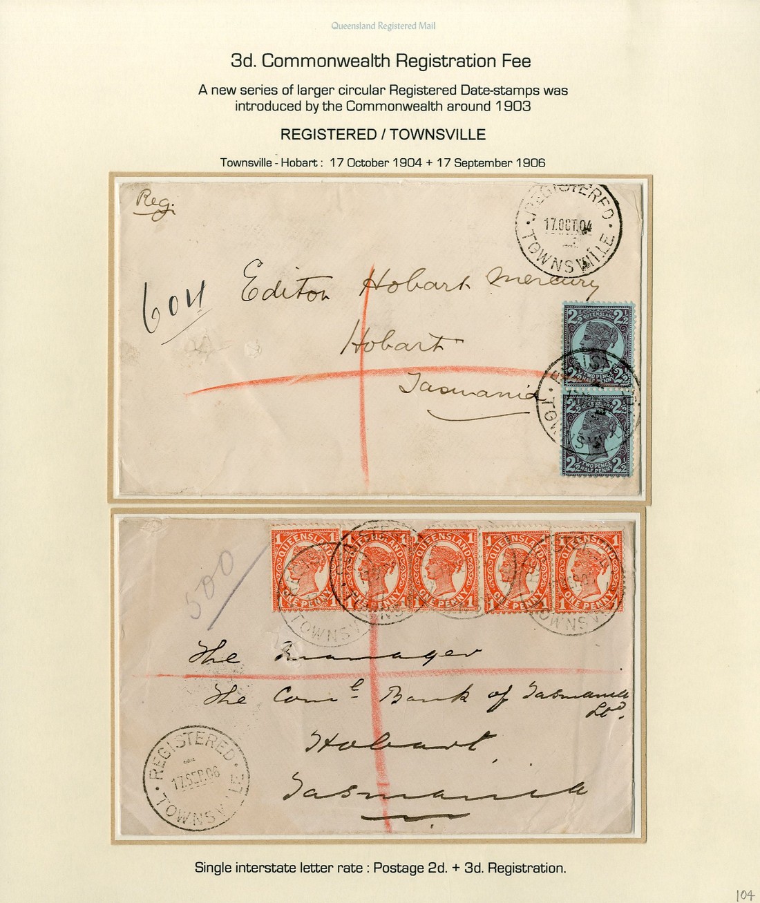 1901-06 envelopes (9) to Tasmania all franked at the 3d. U.P.U. registration fee and showing Registered c.d.s. for Bundaberg (1904 and the earliest recorded date of use), Charters Towers (2), Maryborough (2), Rockhampton (2) and Townsville (2); spike holes though an attractive group