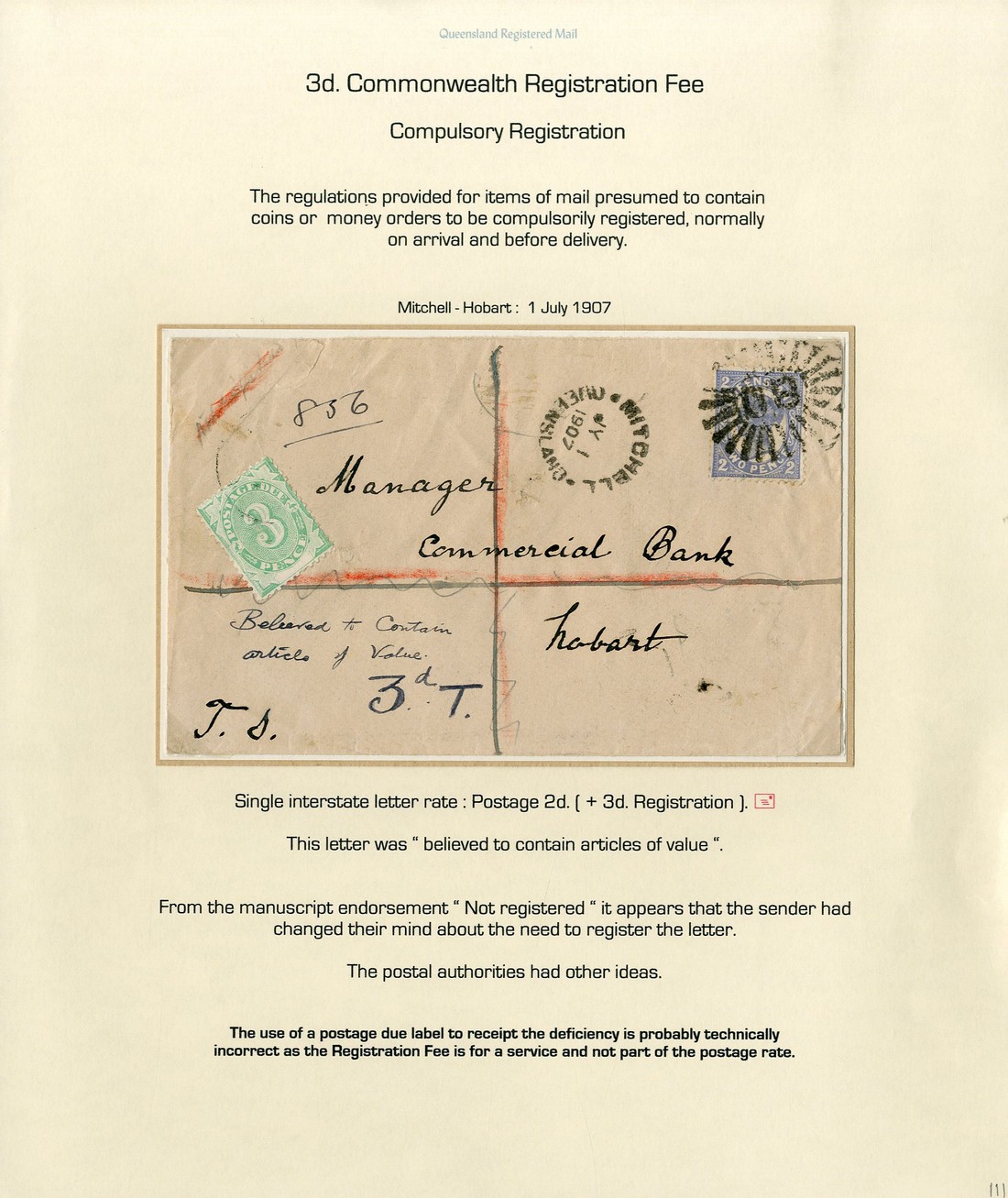 1905 (28 Oct.) envelope (no flap and one corner damaged) from Girofia to Hobart franked at 2d., compulsorily registered as "Supposed to contain value", showing manuscript "Defic postage 2d./Fine 2d/Reg. fee 3d." in red ink and with original charge of "3D" altered to "7D" (demonstrating that no fine was payable on unpaid registration), and 1907 (1 July) envelope from Mitchell to Hobart, similarly treated and bearing Postage Due 3d., lightly tied by c.d.s., technically incorrect as the registration fee is for a service and not part of the postage rate. An most unusual and possibly unique pair