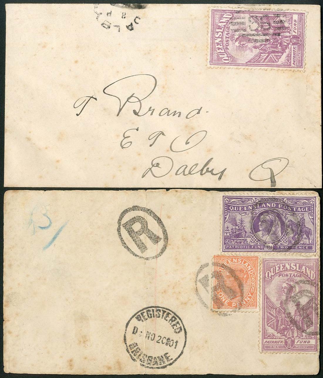 1900 Charity 1d. cancelled "96" in bars and tied on envelope (no year date) to Dalby showing part arrival c.d.s. at top; 1d. and 2d., together with Sideface 1d., all cancelled "r" in oval on 1901 large piece showing Brisbane c.d.s.; both items a little soiled, otherwise sound. Cat. £395+