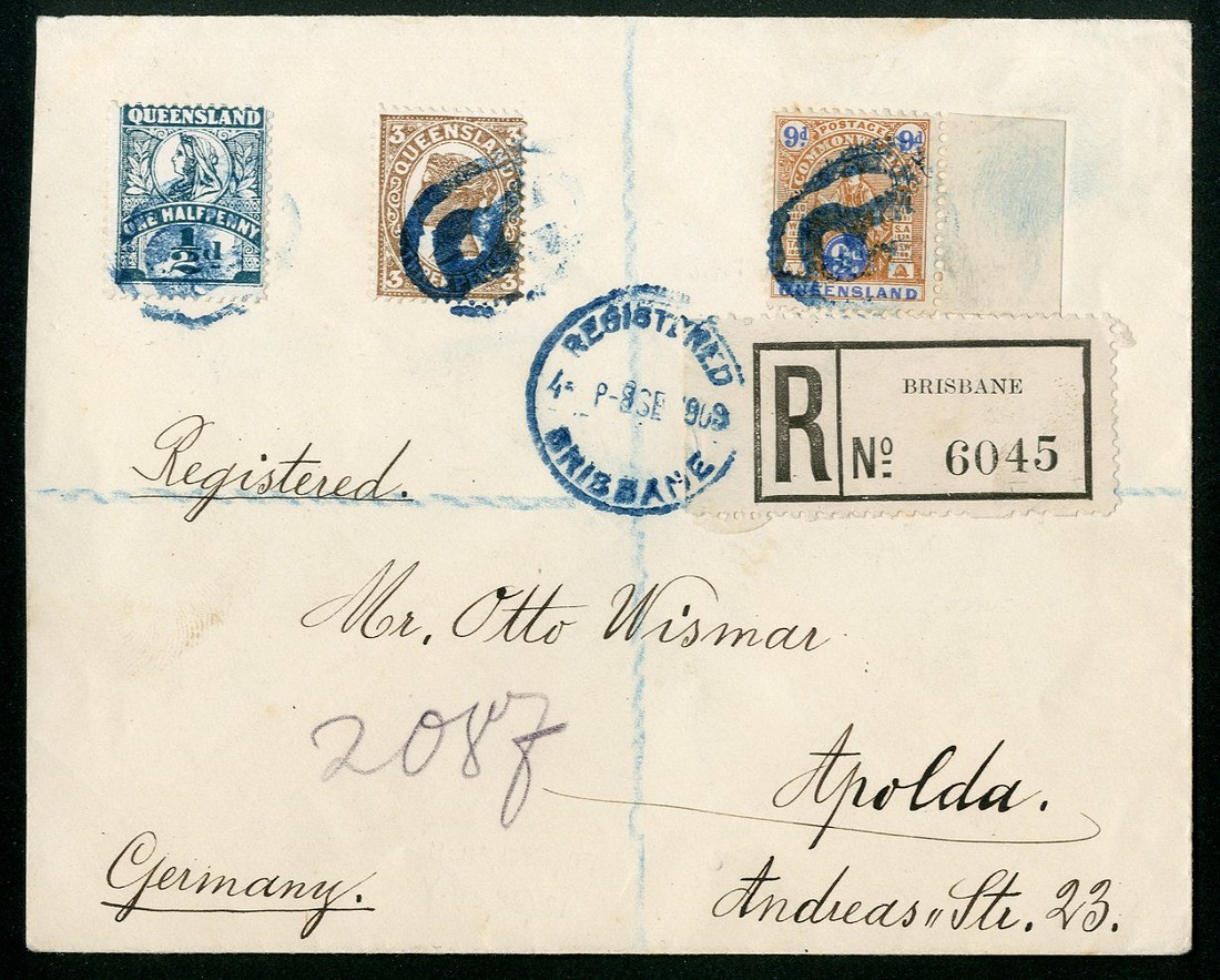 1908 (8 Sept.) envelope from Brisbane to Germany, bearing 9d. perf. 12x12½ Type B (marginal) in combination with 1907-11 ½d. and 3d. all cancelled "R" in oval in blue and with black registration label tied by c.d.s. in the same ink; a scarce stamp on cover