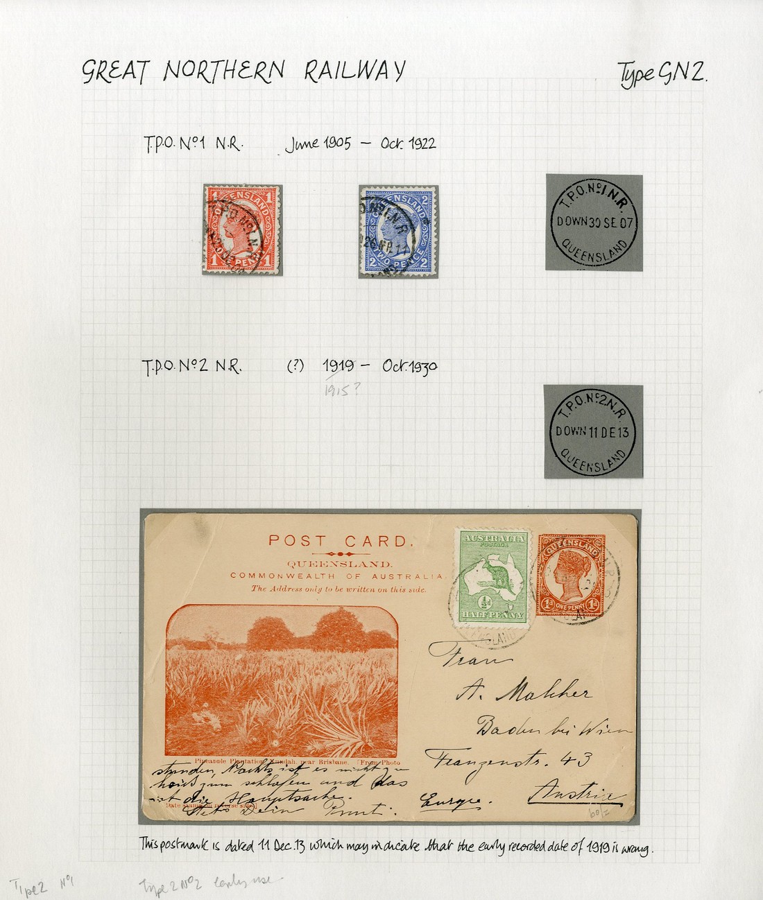 great northern railway: A selection of loose adhesives/pieces (9) including Chalon 1d. pair with two clear large part "g.n. railway/1/queensland" c.d.s. and Sideface 1d. (2) with part strikes numbered "1" and "2", 1903 and 1904 envelopes, the first bearing 2d. cancelled "573" with GN1 "t.p.o. no. 2 northern ry/down" c.d.s., the second from Winton with similar c.d.s. on reverse, and 1913 1d. card, uprated with Kangaroo ½d., to Austria cancelled by light GN2 "t.p.o. no. 2 n.r." c.d.s.