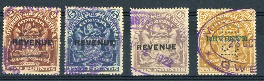 1907 overprinted "revenue", Arms £2, £5, £10 and £20 with oval datestamps in violet, the latter perfined "used", fine. Barefoot 20-23