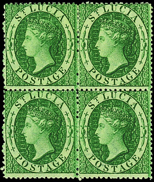 — 6d. deep green block of four, fine unused with part original gum. A scarce multiple. S.G. 3b, £1400. Photo