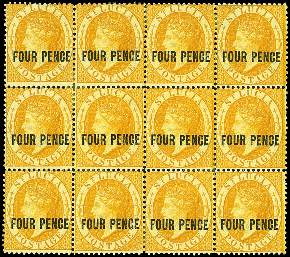 1882-84 CA perf 14, 4d. yellow block of twelve (4x3), fresh and fine unused with mainly large part original gum. A rare multiple. S.G. 27, £3600. Photo