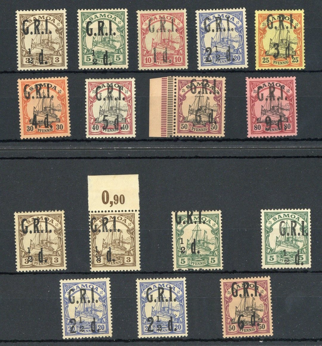 1914 GRI ½d. on 3pf. (3 including one without fraction and one with "1" to left of "2" in "½"), ½d. on 5pf. (3 including one without fraction and one with "1" to left of "2" in "½"), 1d. on 10pf, 2½d. on 20pf (3 including one without fraction and one with "1" to left of "2" in "½"), 3d. on 25pf., 4d. on 30pf., 5d. on 40pf., 6d. on 50pf (2, one with inverted "9" for "6") and 9d. on 80pf., fine mint. S.G. 101-109, £1495